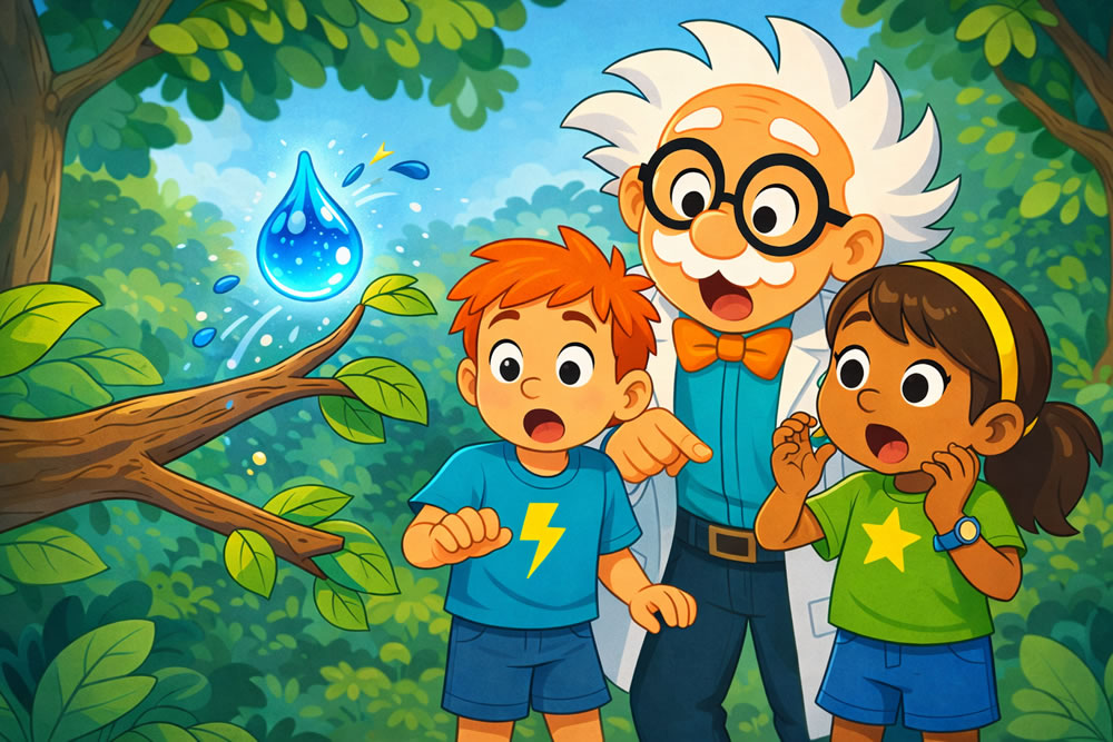 A small blue droplet wobbled on a leaf… then plopped to the ground and bounced.